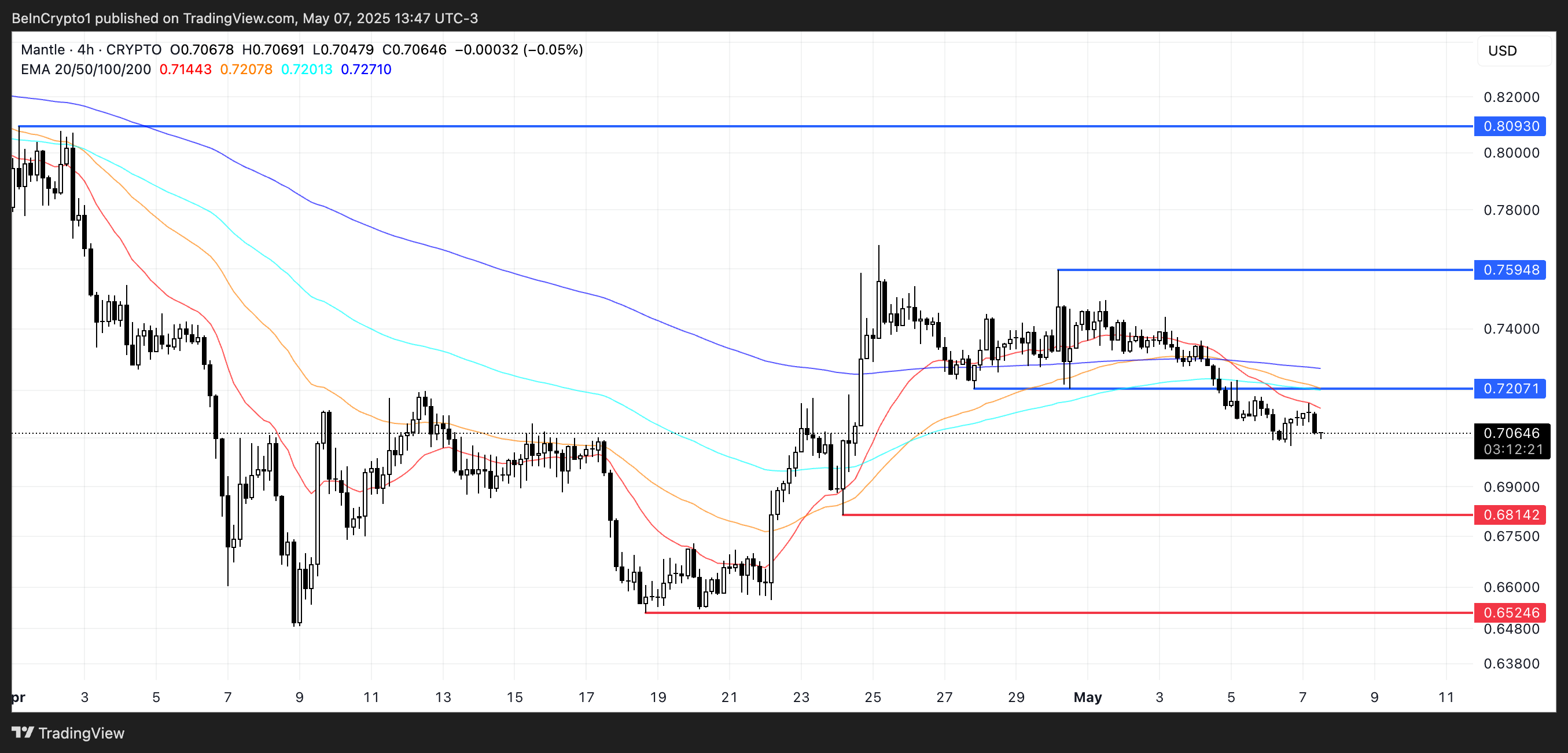 MNT는 며칠 전 데스크로스를 형성했으며, 지난 7일 동안 2.6% 하락하여 지속적인 하락 압력을 나타냅니다. 다음 주요 지지 수준은 0.68 달러이며, 이 수준이 유지되지 않으면 가격은 0.652 달러까지 더 하락할 수 있습니다.
