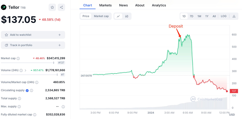 온체인 분석 플랫폼 룩온체인은 트위터를 통해 텔러 팀이 240만 달러 상당의 TRB 토큰 4,211개를 코인베이스에 예치했다고 밝혔습니다. 입금 시점은 TRB가 최고치를 기록한 후 몇 시간 만에 약 70% 폭락한 시점과 거의 일치했습니다.