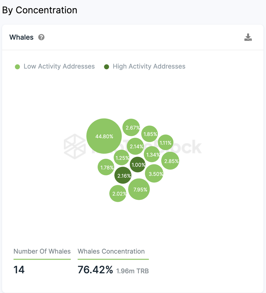 또한, 아래 스크린샷은 단 14개의 고래 지갑이 토큰 공급량의 76%를 통제하고 있음을 보여줍니다. 인투더블록은 TRB 고래를 다음과 같이 정의합니다: