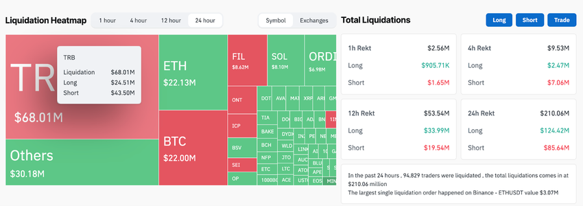 그 결과, TRB는 지난 24시간 동안 비트코인, 이더리움 등 주요 암호화폐를 제치고 가장 많이 청산된 암호화폐 자산이 되었습니다. 아래 스크린샷은 지난 24시간 동안 TRB 트레이더가 청산으로 6,800만 달러 이상의 손실을 입었다는 것을 보여줍니다.