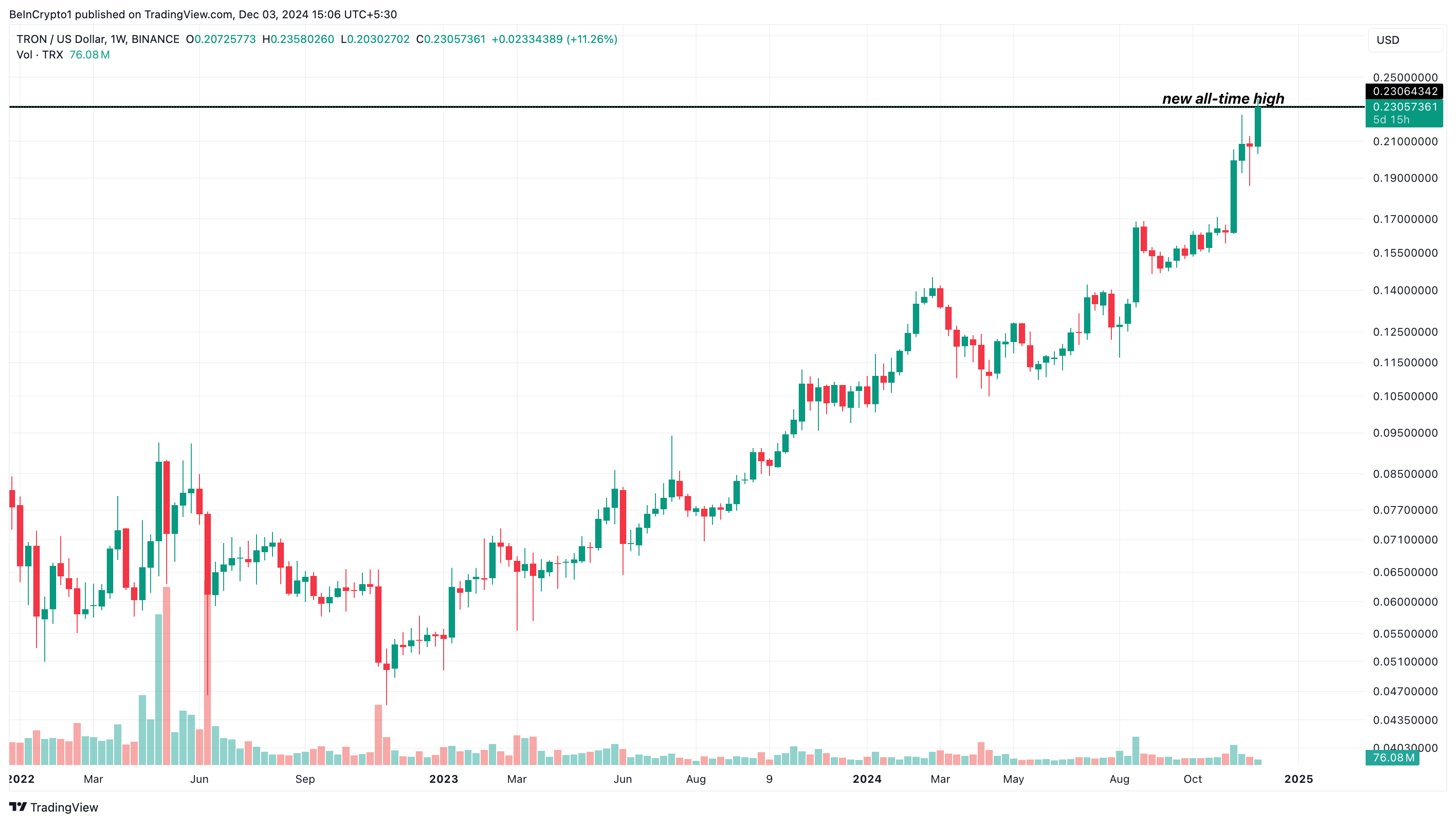 트론(TRX)은 오늘 새로운 사상 최고치를 기록했습니다. 지난 24시간 동안 가격이 12% 상승하여 0.23달러에 도달했습니다. 이로 인해 알트코인의 시가총액이 200억 달러를 넘어섰으며, 이는 또한 새로운 최고치입니다.