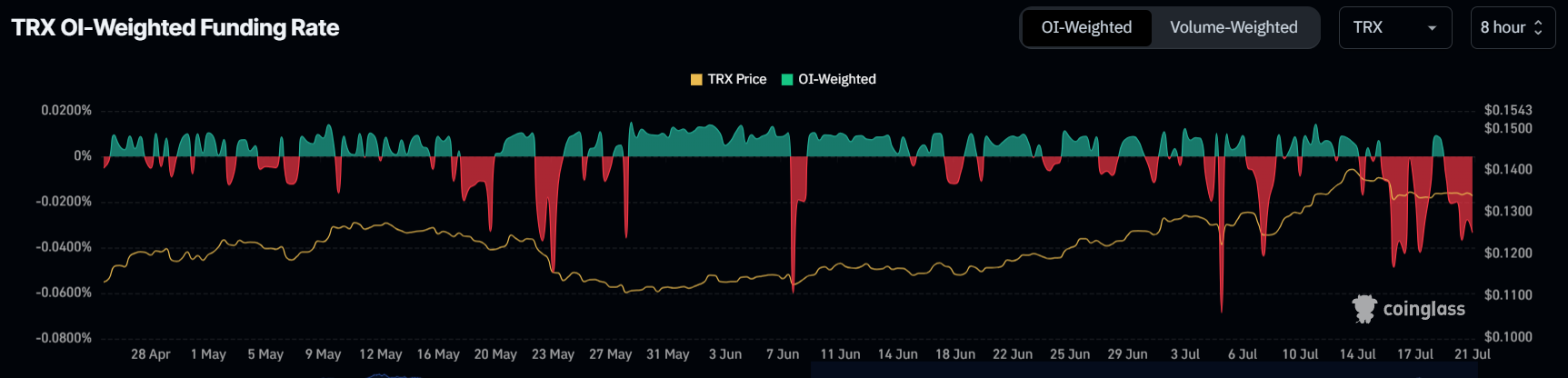 트론(TRX) 가격은 7월 둘째 주에 급등했지만 얼마 지나지 않아 모멘텀을 잃었습니다.