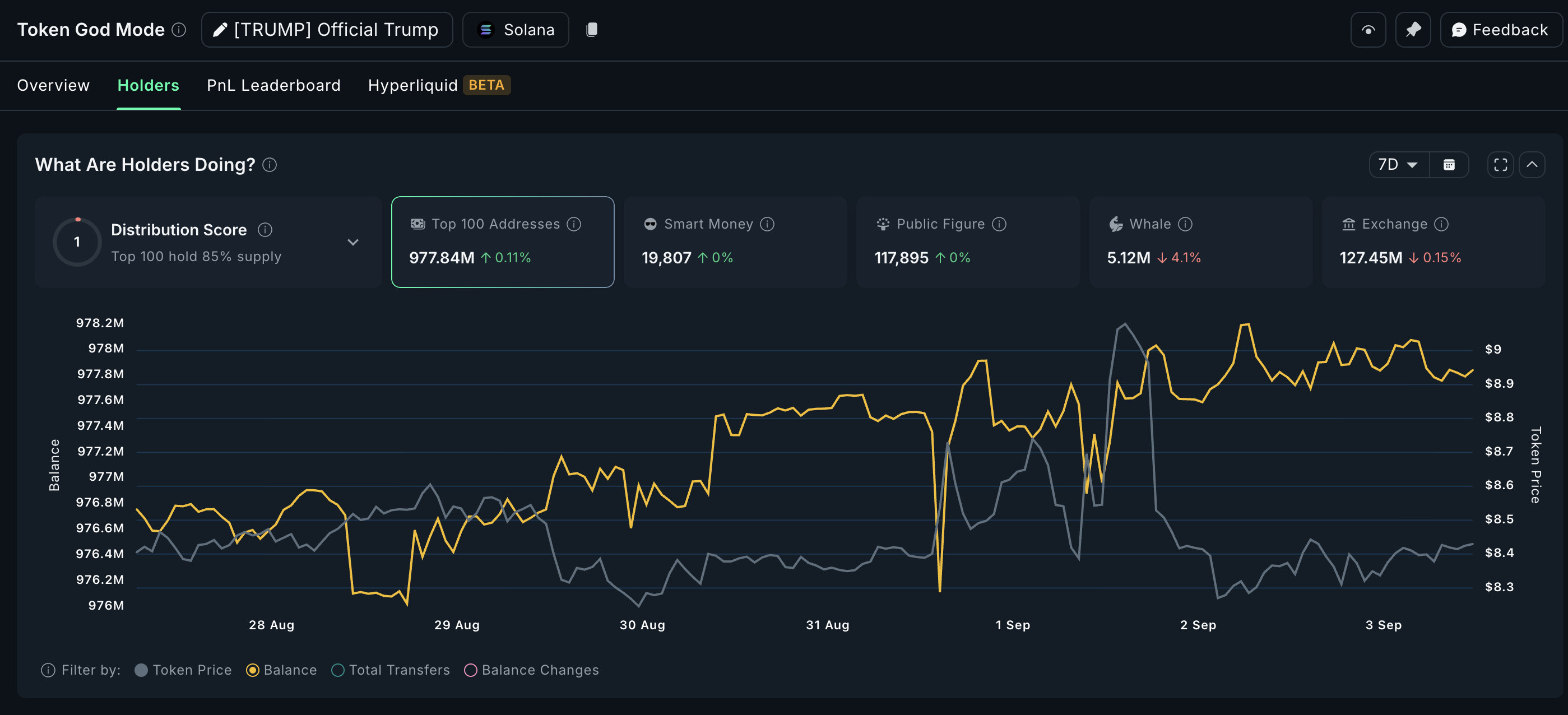 지난 7일 동안의 보유자 잔고 데이터는 혼합된 그림을 보여줍니다. 상위 100개 TRUMP 주소는 약 68만 4천 개의 토큰을 추가했으며, 이는 현재 가격으로 약 574만 달러에 해당합니다. 동시에, 작은 고래들은 약 21만 9천 개의 토큰(184만 달러)을 매도했으며, 거래소 잔고는 51만 2천 개의 토큰(430만 달러)이 감소했습니다.