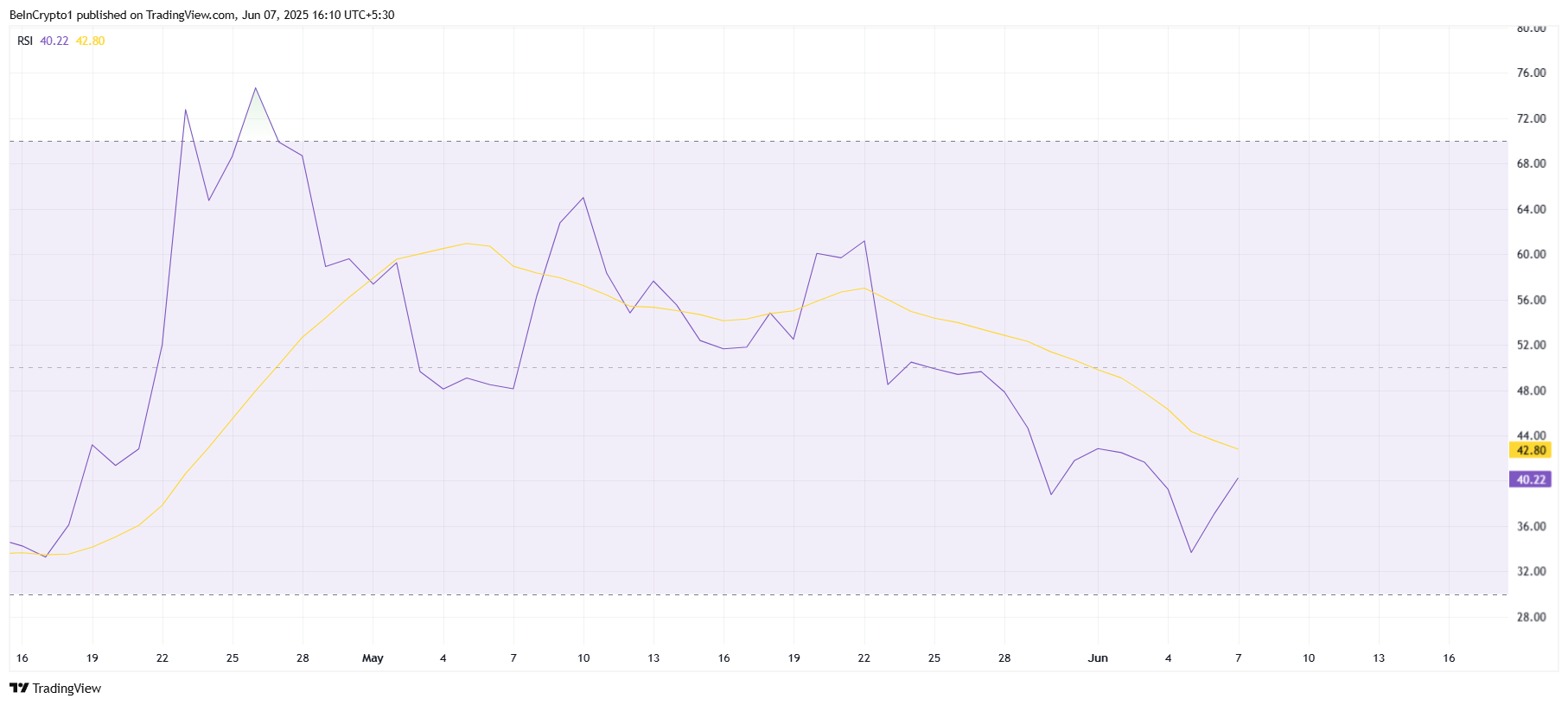 상대 강도 지수(RSI)는 현재 TRUMP에 대해 중립점을 밑도는 부정적인 영역에 있습니다. 이는 시장의 전반적인 신호가 하락세임을 나타내며, TRUMP의 회복에 큰 도전 과제를 제시합니다.