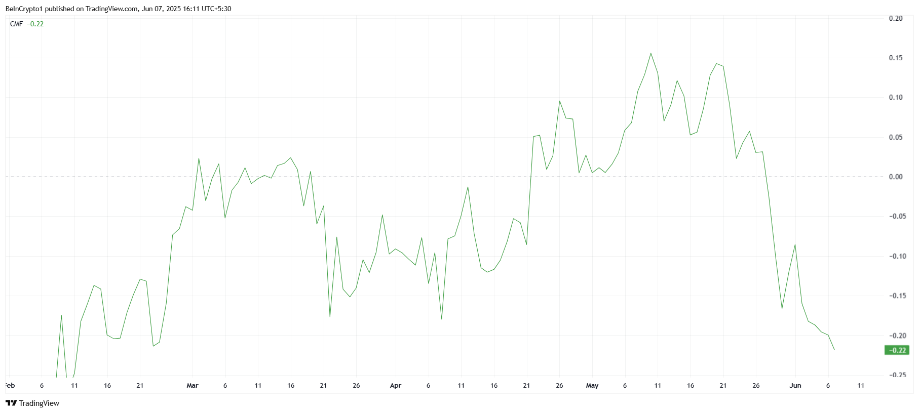 거시적 관점에서 차이킨 머니 플로우(CMF) 지표는 TRUMP에서의 유출이 지배적인 추세임을 강조합니다.