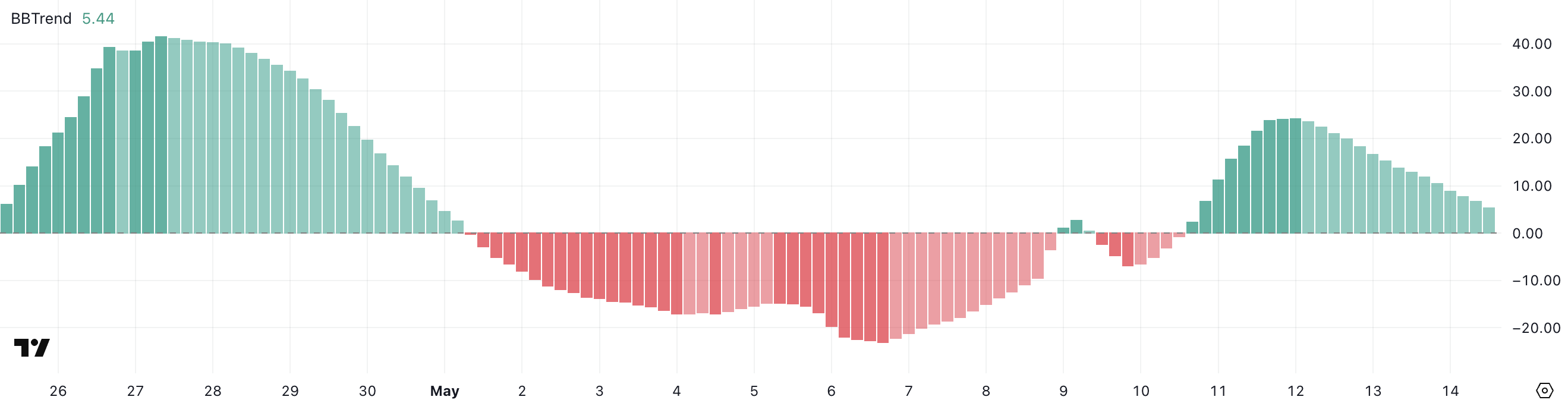 Sponsored SponsoredBBTrend는 볼린저 밴드 트렌드의 약자로, 변동성을 기반으로 가격 움직임의 강도를 측정합니다. 높은 값은 강한 추세를 나타내며, 낮은 값은 조정에 들어가거나 방향이 약해짐을 나타냅니다.