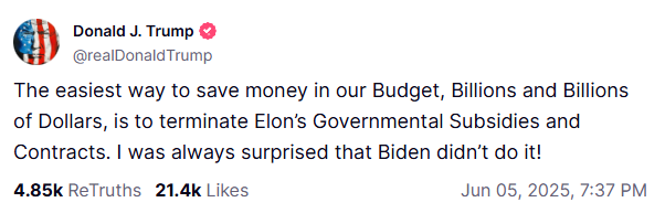 머스크는 며칠 전 D.O.G.E.를 떠났으며, 주요 세금 감면과 국방비 증가를 포함한 “Big Beautiful Bill”에 대해 강력한 반대를 표명했습니다. 오늘 이 법안은 결국 더 큰 갈등을 촉발시켰고, 트럼프는 테슬라 CEO를 공개적으로 비판했습니다.