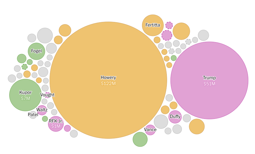 스콧 쿠퍼와 데이비드 포겔 같은 기술 경영진이 행정부에 합류했습니다. 켄 하우어리와 틸먼 페르티타 같은 대사들은 상당한 포트폴리오를 보유하고 있습니다. 페이팔 창립자 하우어리는 최소 1억2200만달러를 보유하고 있습니다.