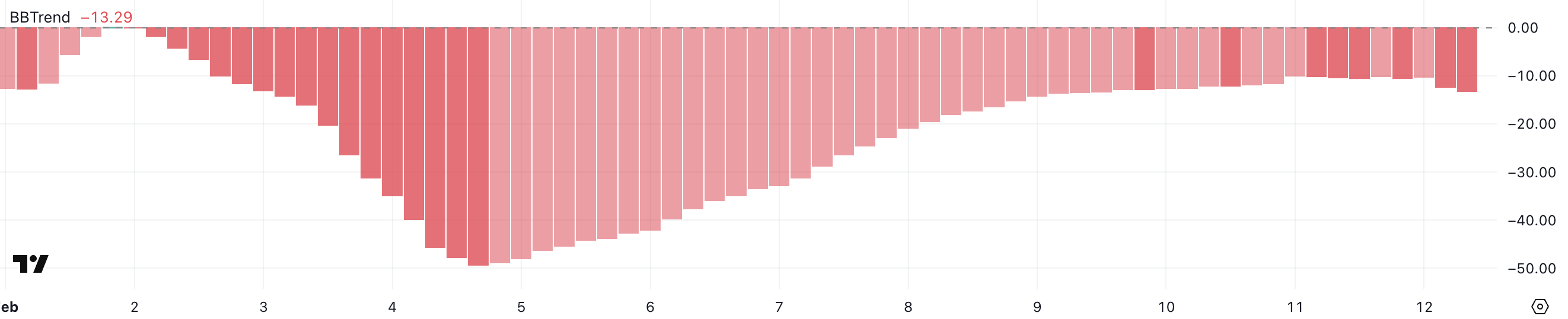 TRUMP 공식 밈코인 BBTrend는 지난 10일 동안 음수 상태를 유지하며, 2월 4일 -49의 최저치를 기록했습니다. 이는 지속적인 하락 모멘텀을 나타냅니다. 가장 깊은 음수 수준에서 회복했지만, 현재 -13.2의 수치는 하락 압력이 여전히 존재함을 시사합니다.