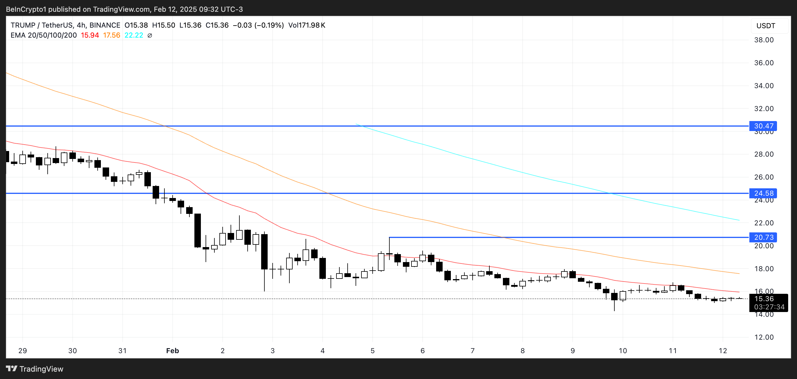 TRUMP는 현재 역사적 저점에서 거래되고 있으며, 지난 7일 동안 22% 하락하여 세 번째로 큰 밈코인 자리를 PEPE에게 내주었습니다.