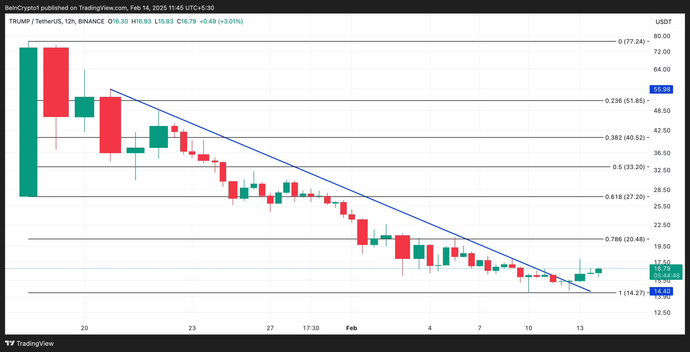 TRUMP의 최근 회복은 이전에 하락세를 유지했던 하락 추세선을 넘어 가격을 상승시켰습니다. 이 패턴은 밈코인이 일중 최고가인 56.20달러에 도달한 1월 20일에 나타났습니다. 현재 보도 시점에서 16.55달러에 거래되고 있으며, 그 이후로 71% 하락했습니다.
