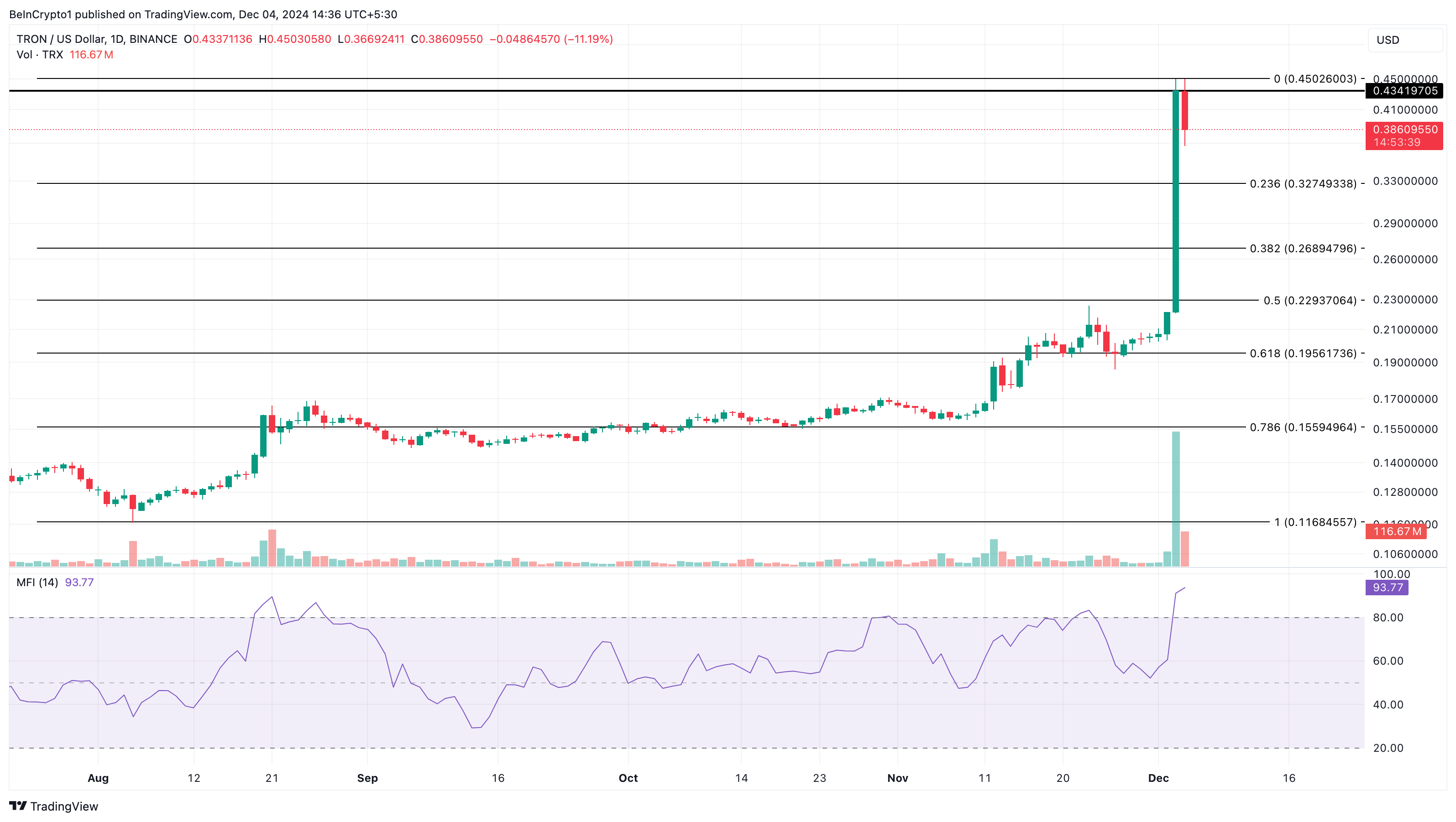 어제, BeInCrypto는 트론의 새로운 사상 최고가인 0.23달러를 보도했지만, 이 이정표는 또 다른 랠리의 시작에 불과했습니다. 오늘 아침, TRX는 0.44달러까지 급등한 후 0.39달러로 후퇴했습니다.