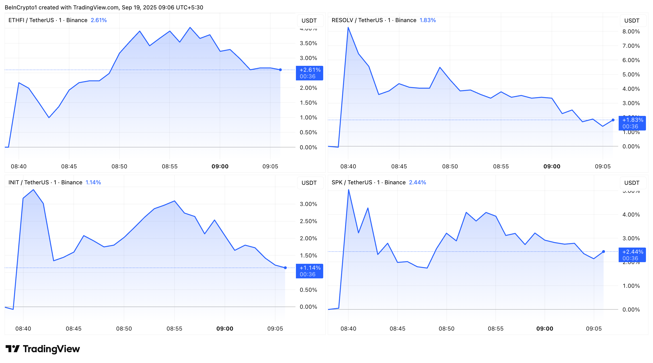 한국 최대 암호화폐 거래소 업비트가 오늘 네 개의 새로운 알트코인 상장을 발표했습니다. 이더피(ETHFI), 리졸브(RESOLV), 이니티아(INIT), 스파크(SPK)는 발표 후 가격이 소폭 상승했습니다.