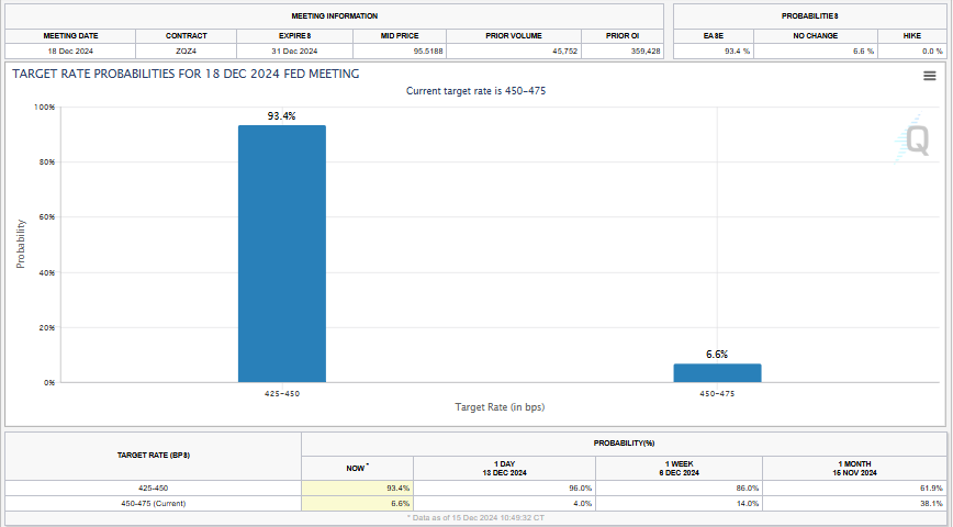 CME 페드워치 도구에 따르면, 시장은 수요일에 25 베이시스 포인트(0.25% bps) 금리 인하를 예상하고 있습니다. 이는 연준이 50 베이시스 포인트(0.5%) 금리를 인하할 확률 6.6%에 반하는 것입니다.