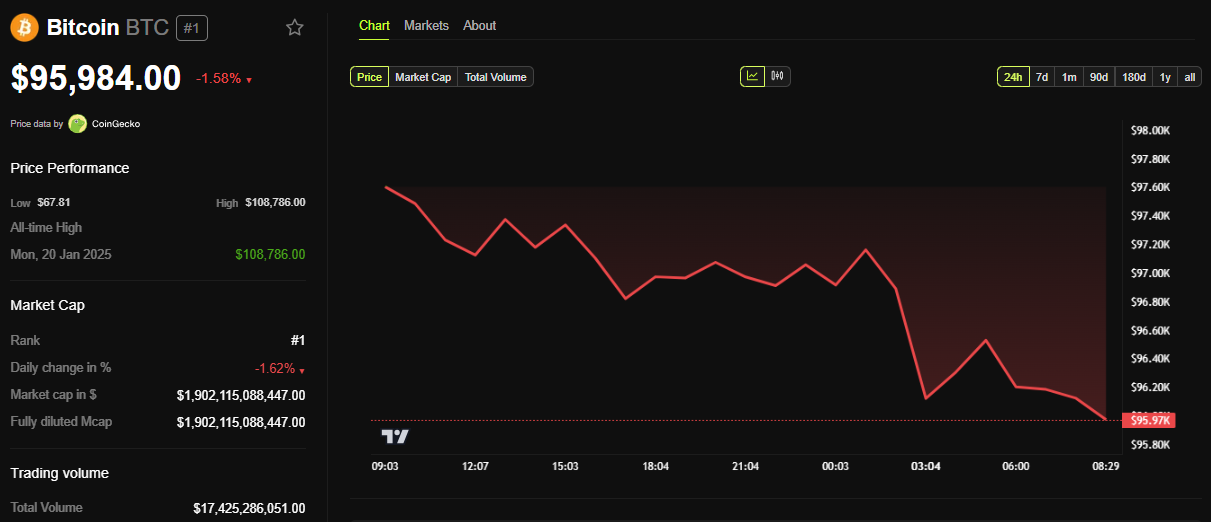 그러나 경제 데이터 발표 전, 비트코인(BTC)은 9만5984달러에 거래되었으며, 월요일 세션이 시작된 이후 1.58% 하락했습니다.