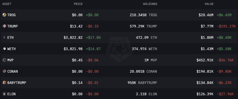 트럼프가 가장 많이 보유하고 있는 암호화폐는 2024년 6월 1일에 출시된 밈 코인인 TROG, 즉 트럼프 프로그입니다. 토큰 공급량의 절반이 트럼프에게 선물되면서 가치가 치솟았습니다. 트럼프가 받은 2,100억 개의 트로그 토큰은 현재 2,246만 달러의 가치를 지니고 있습니다.
