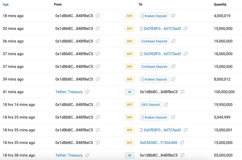 “0x1dBb”로 시작하는 주소를 가진 지갑 소유자는 테더 재무부로부터 자금을 받아 OKX, 크라켄, 코인베이스에 분배했습니다. 보도 시점에 고래 계정에서 가장 최근에 이체된 금액은 550만 USDT였습니다.