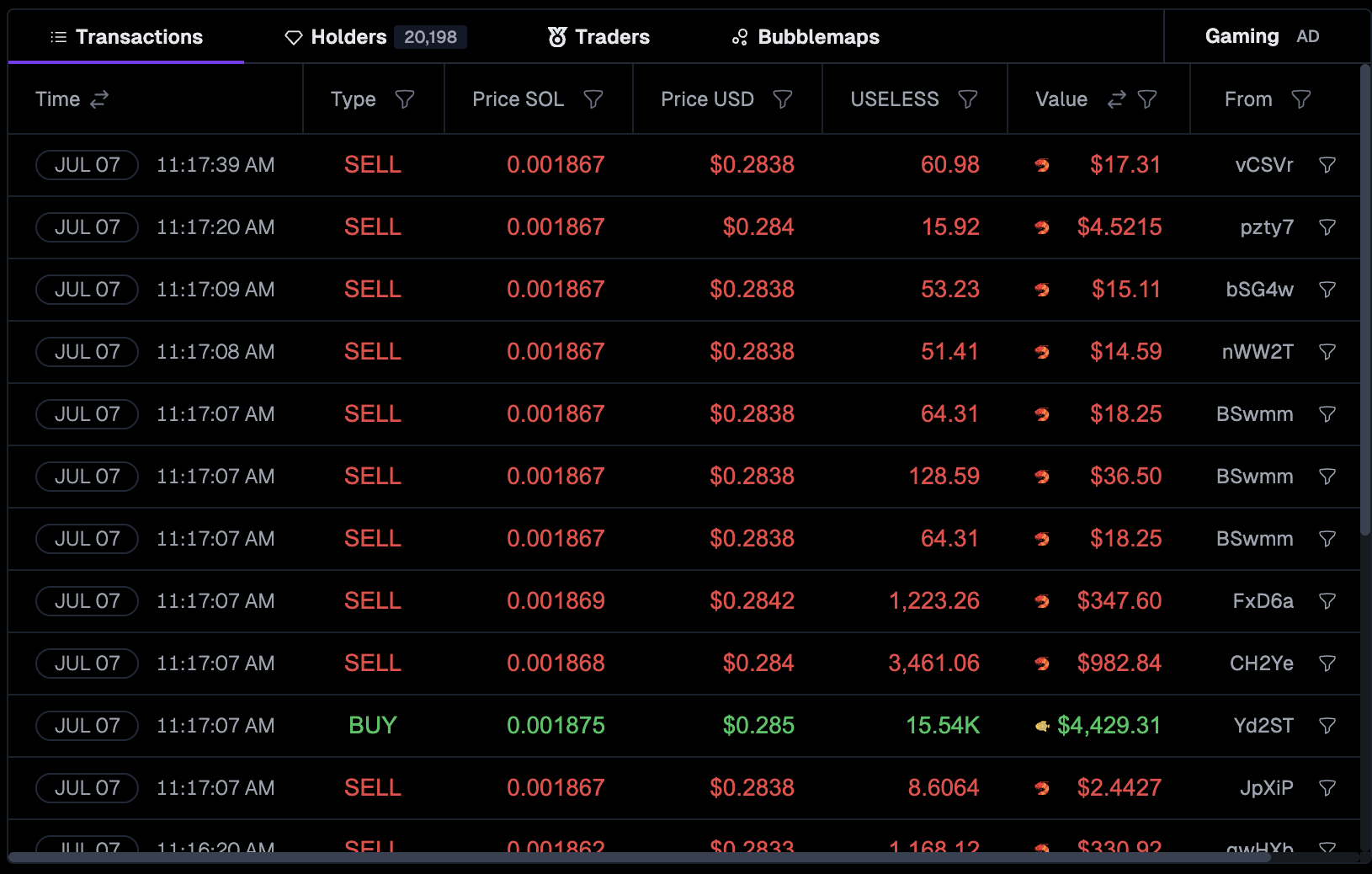 작성 시점에서, 실시간 거래 피드는 매도세가 강합니다. 매도 후 매도가 기록되고 있으며, 드물게 녹색 캔들이 나타납니다. 최근 3,461 USELESS (982.84달러)와 1,223 토큰 (347.60달러)의 소매 매도가 발생했습니다.