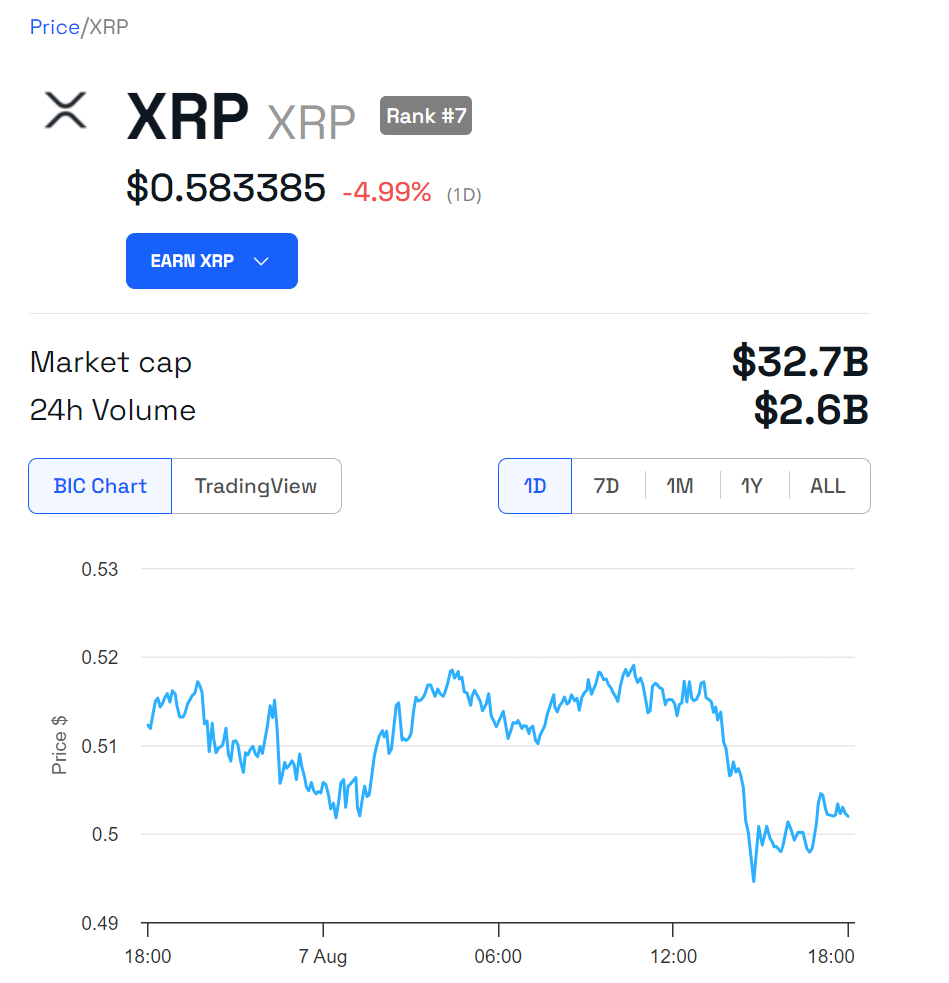 Sponsored최근의 상황은 XRP의 시장 성과에 큰 영향을 미쳤습니다. 법원 명령 이후 XRP 가격은 불과 1시간 30분 만에 0.5018달러에서 0.6373달러로 27% 급등했습니다. 그러나 SEC의 항소 가능성이 보도된 후 XRP 가격은 0.5833달러로 하락하여 지난 24시간 동안 4.99% 하락했습니다.