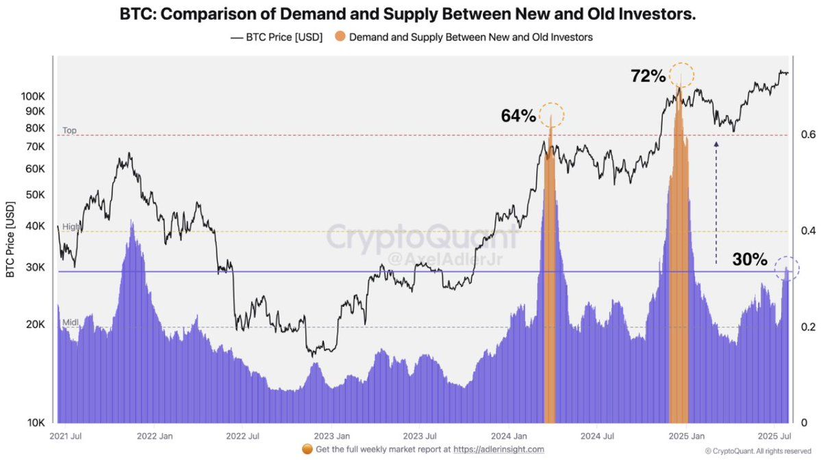 크립토퀀트는 또한 새로운 투자자 지배력이 증가하고 있지만, 극단적인 수준에 도달하기 전까지 여유가 있다고 언급했습니다. 이는 현재 사이클이 이전 사이클처럼 베테랑 보유자들만을 중심으로 돌아가는 것이 아니라, 많은 새로운 참가자들을 끌어들이고 있음을 나타냅니다.