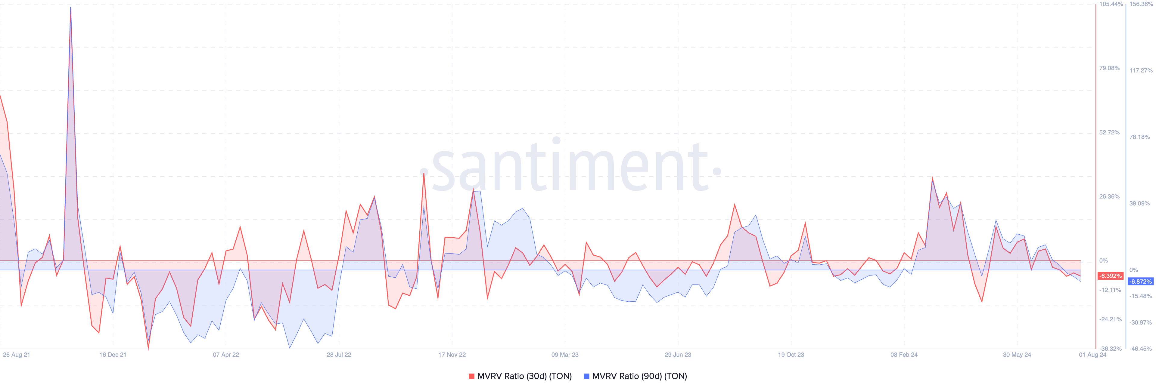 TON의 시장가치 대비 실현가치(MVRV) 비율을 보면 알트코인이 현재 저평가되어 있으며, 매수 신호가 깜박이고 있음을 알 수 있습니다.