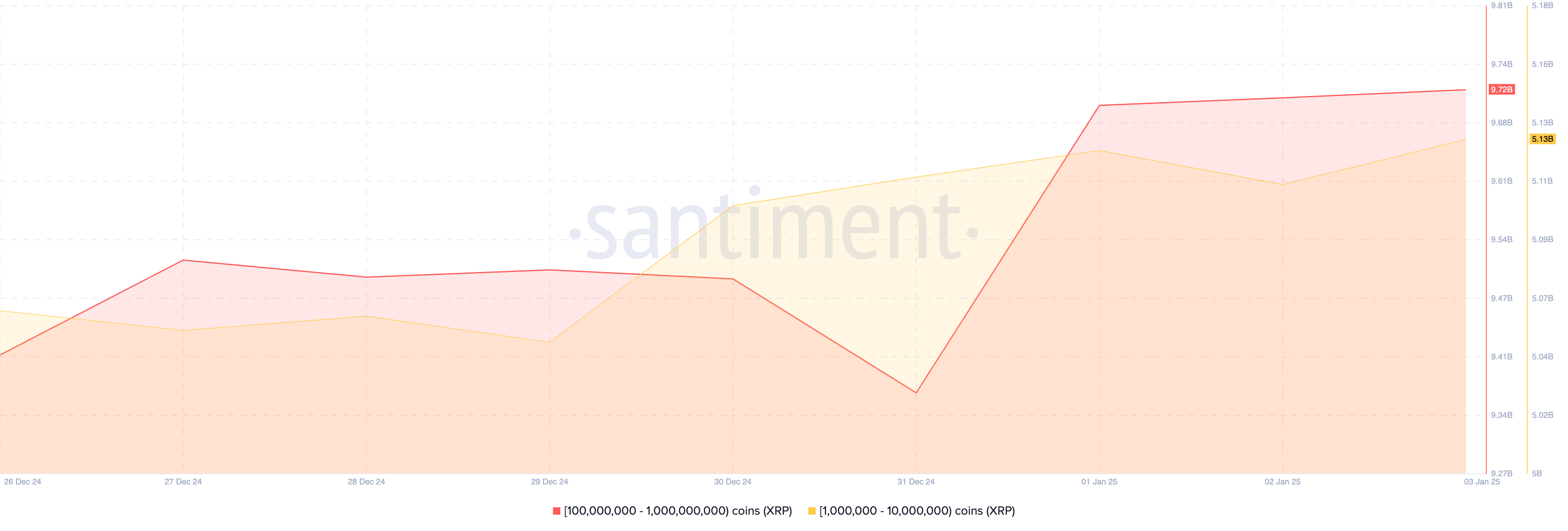 센티멘트에 따르면, 다양한 XRP 그룹이 2025년 1월에 잠재적 이익을 위해 알트코인을 매수하기로 결정했습니다. 예를 들어, 100만에서 1천만 개의 토큰을 보유한 주소는 자산을 50억5000만개에서 51억3000만개로 늘렸습니다.