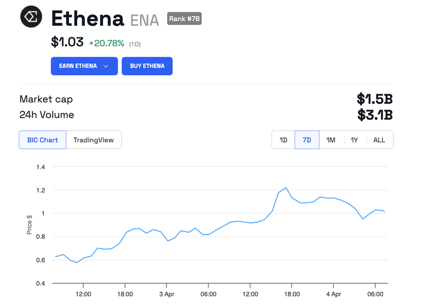 한편, 에테나의 토큰 ENA는 상장 후 200% 이상 가격이 상승하며 상승세를 보이고 있습니다. 불과 24시간 만에 20% 이상 상승하여 현재 1.03달러에 거래되고 있습니다.