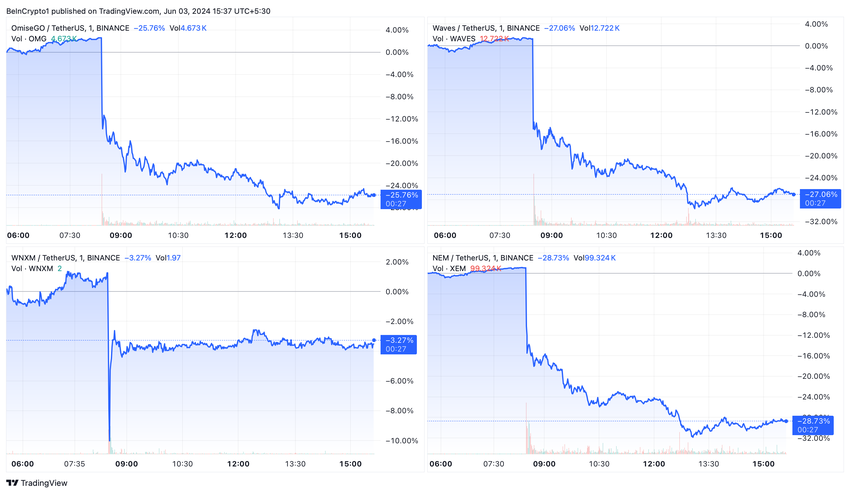 발표 이후 해당 알트코인의 가치는 급격히 하락했습니다. 구체적으로 OMG는 25.76%, 웨이브는 27.06%, XEM은 28.73% 하락했습니다. 반면, WNXM은 시장 조정에서 빠르게 회복하여 현재 3.27% 하락에 그쳤습니다.