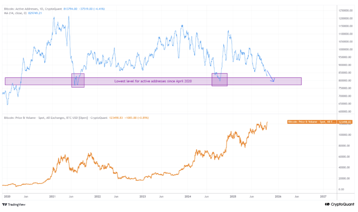 보고서에 따르면, 비트코인의 가격이 상승했지만, 활성 지갑 주소의 일일 수(14일 이동 평균)가 “2020년 4월 이후 최저 수준에 접근하고 있습니다.”