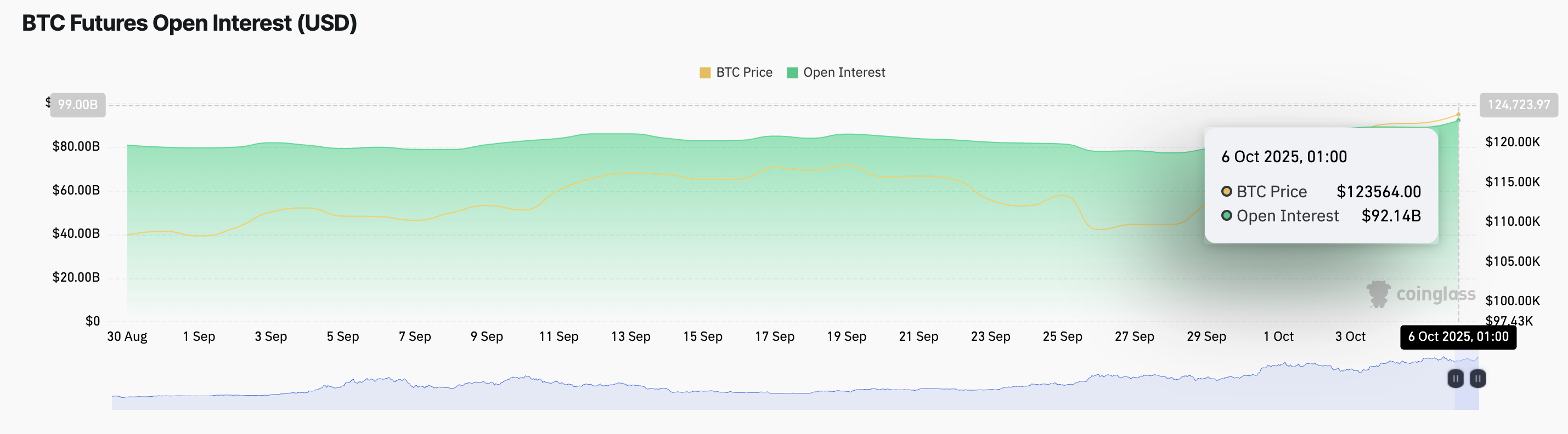 BTC의 선물 미결제 약정의 증가도 이 하락 전망을 확인합니다. 코인글래스에 따르면, 이는 현재 연초 대비 최고치인 $92.14 십억 달러에 있으며, 10월 1일 이후 10% 상승했습니다.