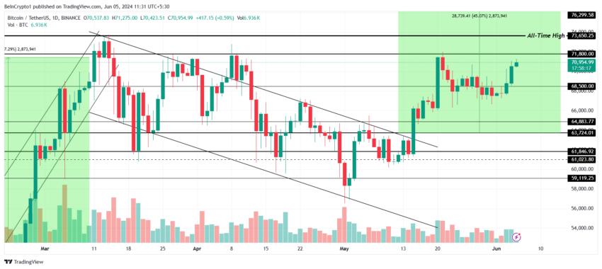 비트코인 가격은 지난 24시간 동안 70,000달러 이상으로 상승하여 71,800달러의 장벽에 근접했습니다. 이 저항선은 비트코인이 사상 최고치를 경신하는 것을 막고 있습니다.