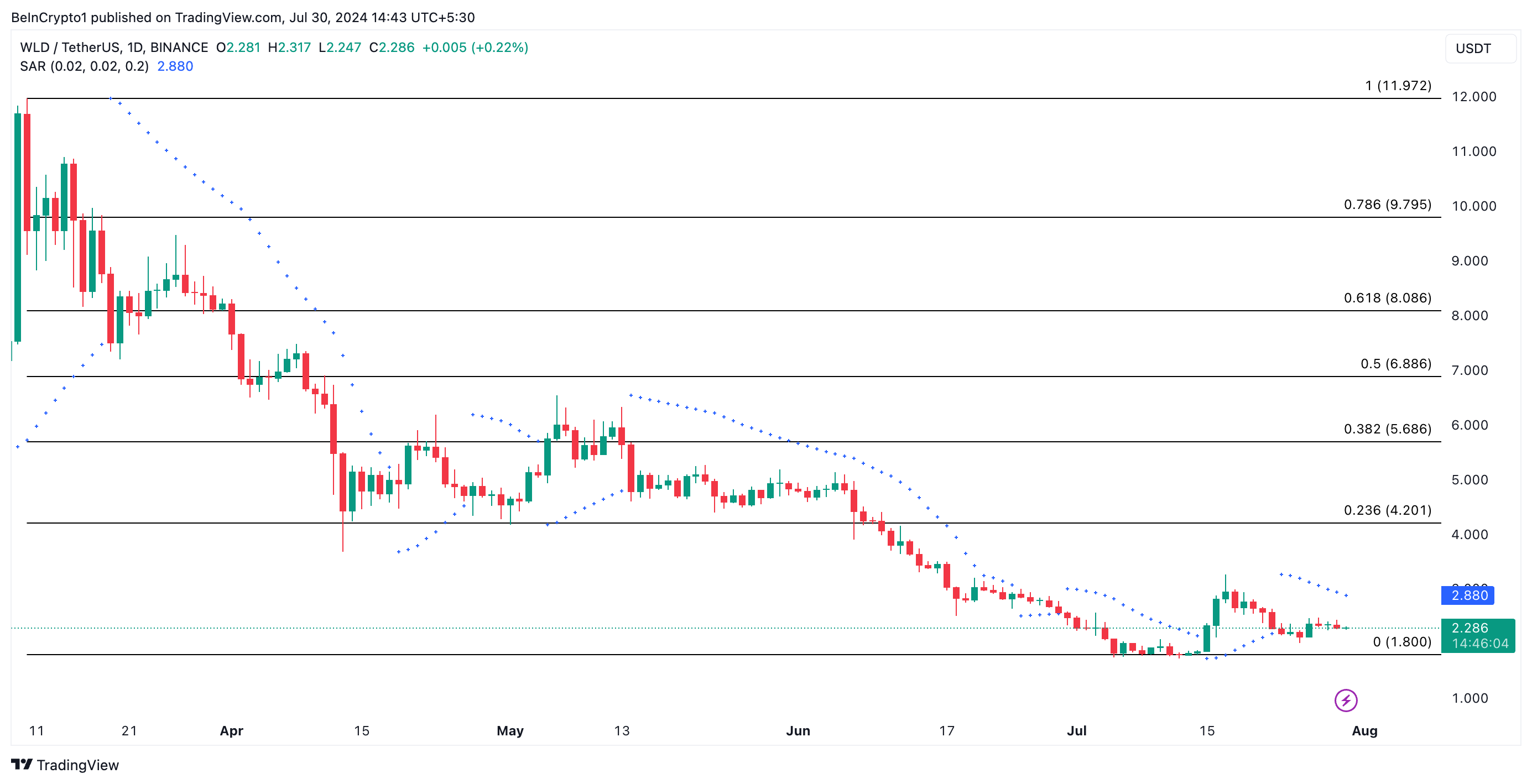 WLD의 가격이 계속 하락하면 2달러 이하에서 거래될 것입니다. 다음 목표 가격은 1.80달러입니다.