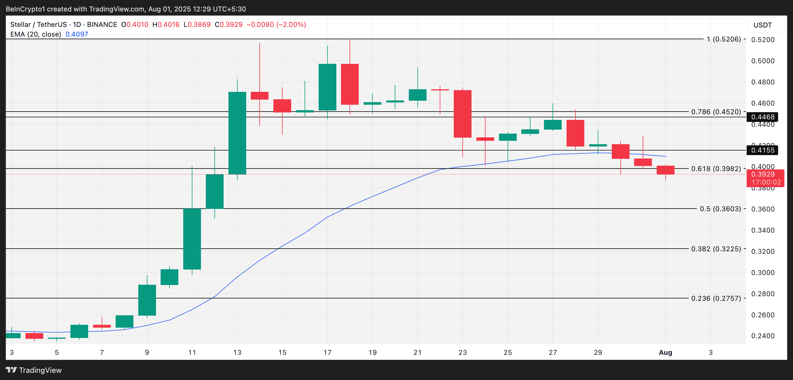 XLM/USD 일일 차트의 판독값은 토큰 가치의 두 자릿수 하락이 가격을 20일 이동평균선(EMA) 아래로 밀어냈음을 보여줍니다. 이 주요 이동평균선은 보도 시점에 0.40 달러에서 XLM 위에 동적 저항을 형성합니다.
