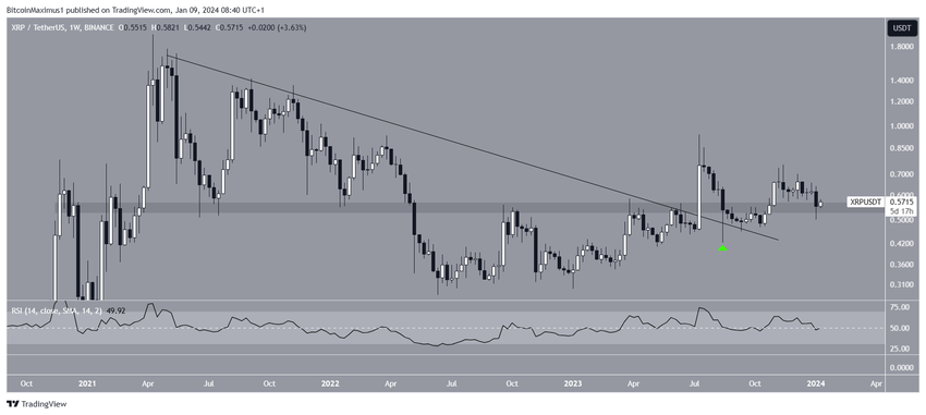 XRP 가격은 2021년 이후 간헐적으로 지지선과 저항선 역할을 하는 수평 영역 위에서 거래되고 있습니다.