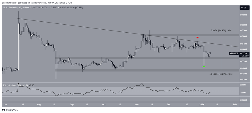 가격 움직임은 리플이 2023년 7월 이후 단기 하강 저항 추세선 아래로 떨어졌음을 보여줍니다. 이 추세선은 여러 번 검증되었으며, 가장 최근에는 12월에 확인되었습니다(빨간색 아이콘).