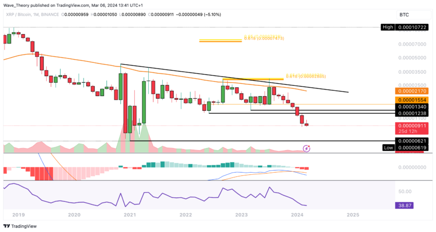 리플의 가격은 비트코인 대비 눈에 띄는 하락 추세를 보이고 있으며, XRP 가격의 다음 주요 지지선은 약 0.0000062 BTC로 추정됩니다.