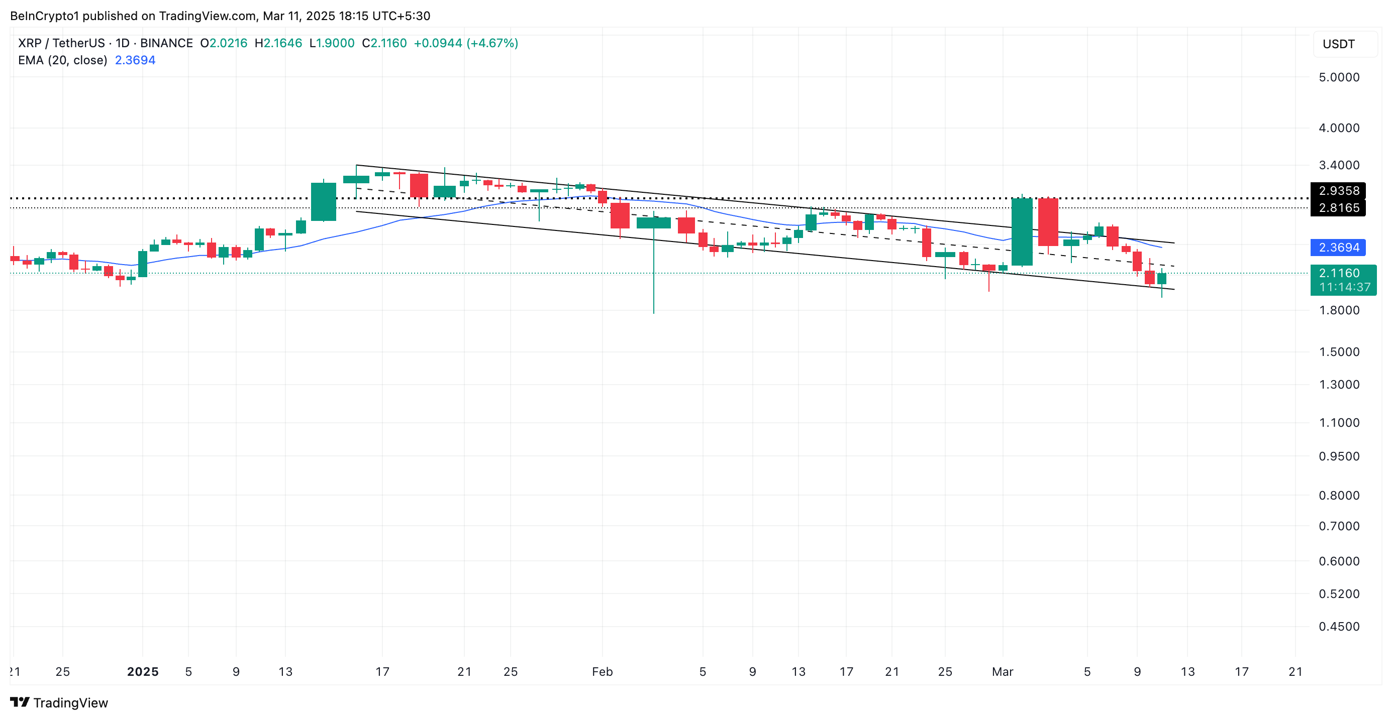 XRP는 현재 2.11달러에 거래되고 있으며, 20일 이동평균선(EMA) 아래에서 거래되고 있습니다. 이 주요 이동평균선은 최근 가격에 더 많은 가중치를 두어 단기 추세를 반영합니다.