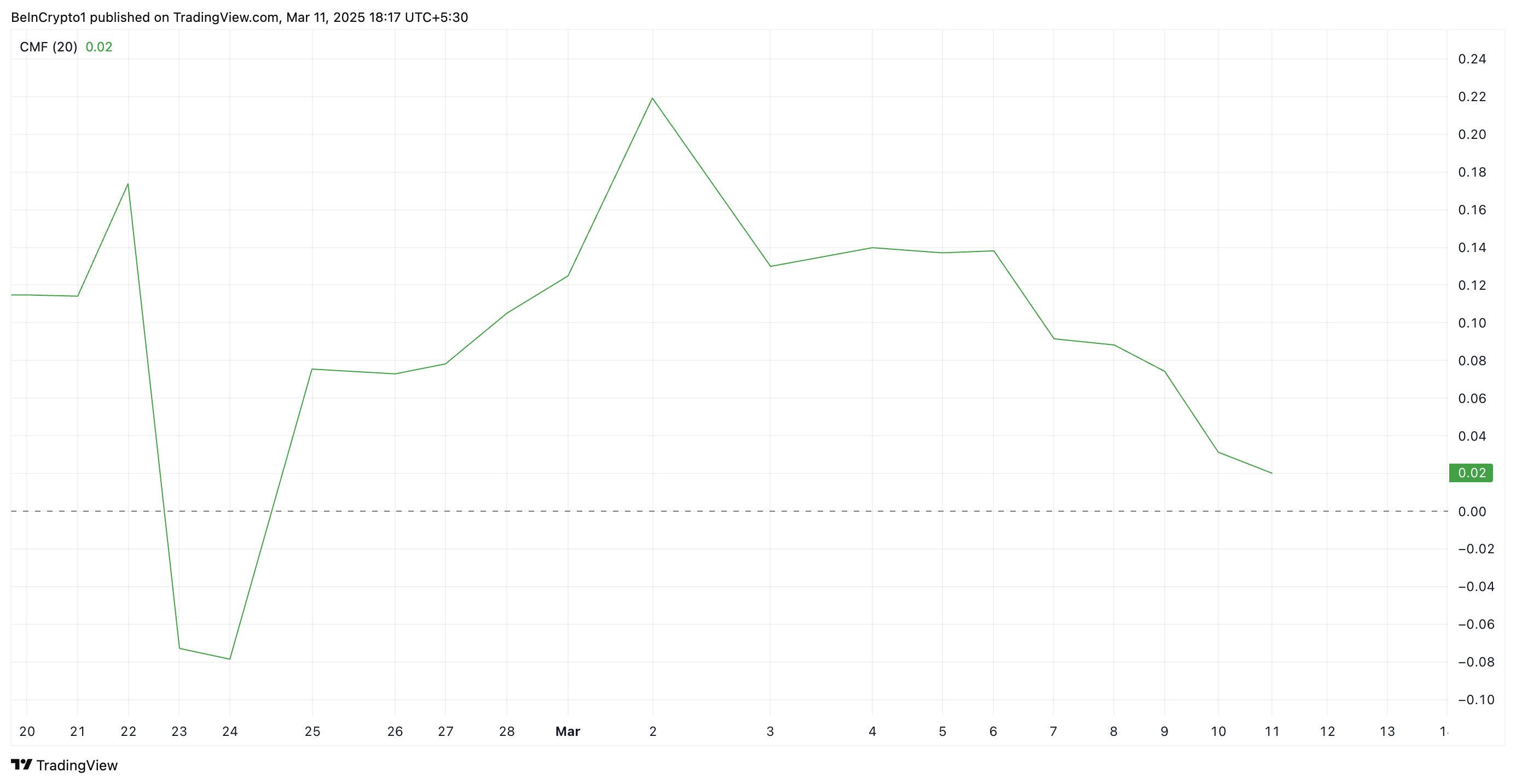 또한, XRP의 차이킨 머니 플로우(CMF)는 현재 하락세에 있으며, 0선 아래로 떨어질 준비가 되어 있습니다. 이 지표는 자산으로의 자금 흐름을 측정하며, 현재 0.02입니다.