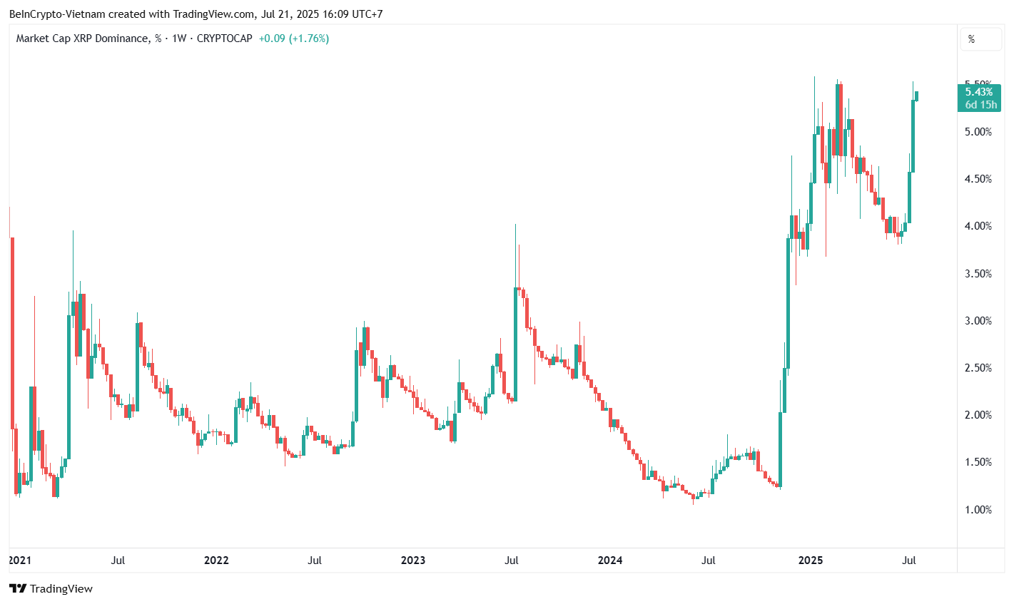 마지막으로, XRP 지배력(XRP.D) 지수는 5%를 넘었습니다. 이는 2025년 최고치에 근접하며 더 상승할 가능성이 있습니다.