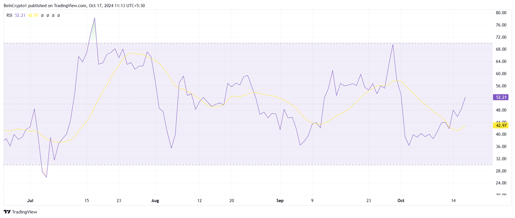 보다 넓은 관점에서 보면 XRP의 거시적 모멘텀이 점차 쌓이고 있습니다. 상대 강도 지수(RSI)가 지난 2주 동안 상승하며 중립선 50을 넘어서, 상승 모멘텀으로 전환되었습니다. RSI 상승은 시장 참여자들이 XRP에 대한 신뢰를 회복하고 있음을 시사하며, 가격을 더 높이 밀어 올릴 필요한 힘을 제공할 수 있습니다.
