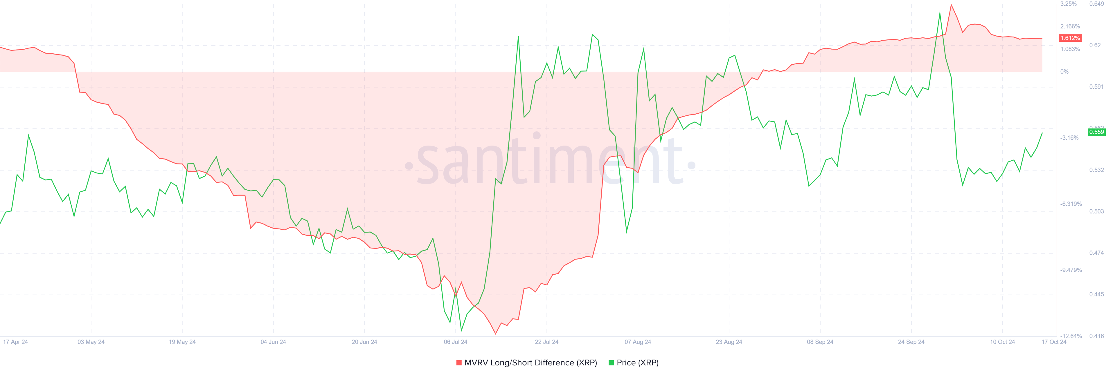 실제 XRP 가격 추이를 보면 지난 한 달 동안 단기 보유자들의 차익 실현이 상당히 이뤄졌을 가능성이 엿보입니다. 9월 말에는 XRP 가격이 18% 하락을 보이기도 했습니다. 그럼에도 불구하고 MVRV 장단기 차이가 계속 플러스 값을 유지한다는 것은 장기 보유자들이 강하게 버티고 있음을 시사하는 부분입니다.