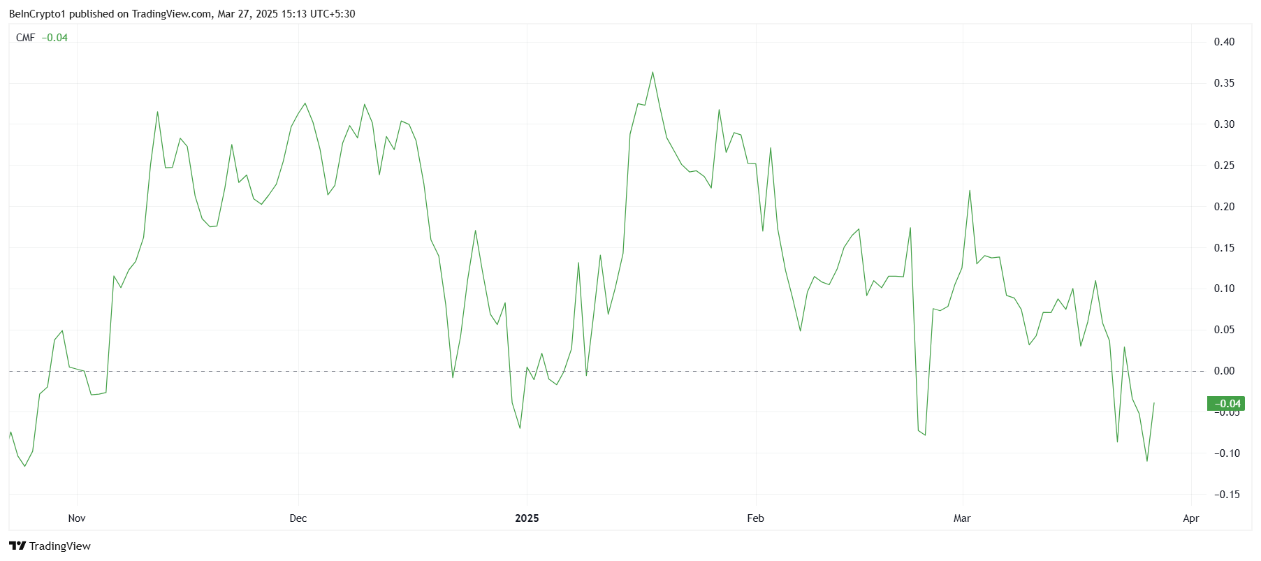 XRP의 거시적 모멘텀은 강한 신호를 보이지 않고 있습니다. 기술 지표는 전체 시장 심리를 반영하고 있습니다. XRP의 차이킨 머니 플로우(CMF)는 4개월 만에 최저치로 떨어졌습니다. 이는 0선 아래에 머물며 약세를 나타냅니다. 이는 현재 시장 상황 때문에 투자자들이 XRP에 더 많은 돈을 투자하지 않으려 한다는 것을 시사합니다.