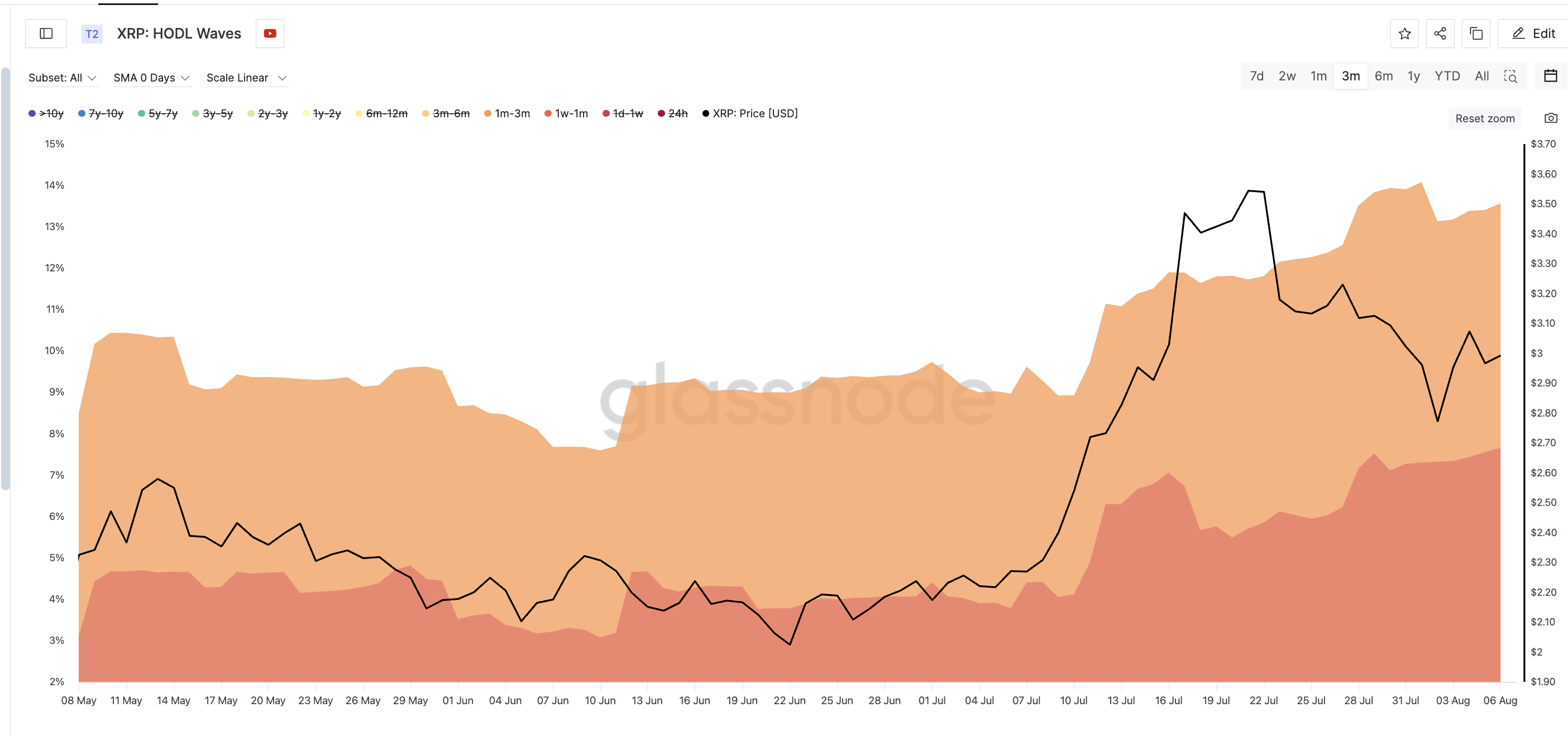 HODL 웨이브는 코인이 지갑에 얼마나 오래 보관되었는지를 보여주며, 단기 또는 장기 보유자가 시장 행동을 주도하는지를 판단할 수 있게 합니다. 여기서는 최근 축적을 추적하기 위해 1주-1개월 및 1개월–3개월 밴드에 집중했습니다.