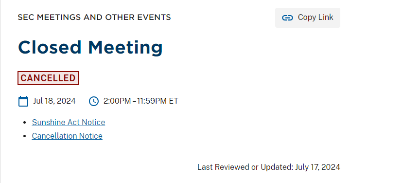 회의 취소한 이유는 아직 알려지지 않고 있습니다. 그럼에도 불구하고 SEC의 선샤인법 공지가 의제 가운데 주요 규제 이슈로 포함되었다는 점은 주목할 가치가 있습니다.