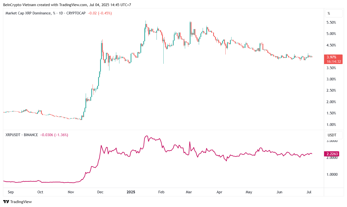 트레이딩뷰 데이터에 따르면 XRP 지배력은 2024년 말 1.1%에서 2025년 1분기 5.5%로 상승한 후 오늘날 3.97%로 조정되었습니다.