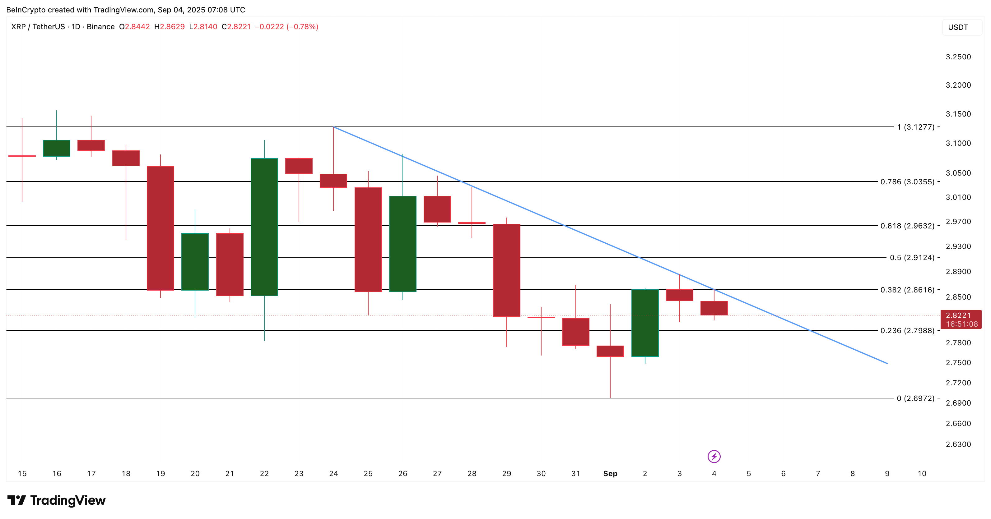 XRP 가격이 피로의 징후를 보입니다. 2.82달러에서 토큰은 지난 24시간 동안 거의 변동이 없으며, 지난주에 약 7%, 지난달에 6% 하락했습니다. 이는 단기 반등의 희망을 압박하지만, 3개월 동안 32.5% 상승한 것은 기술적으로 더 넓은 추세가 상승세임을 유지합니다.