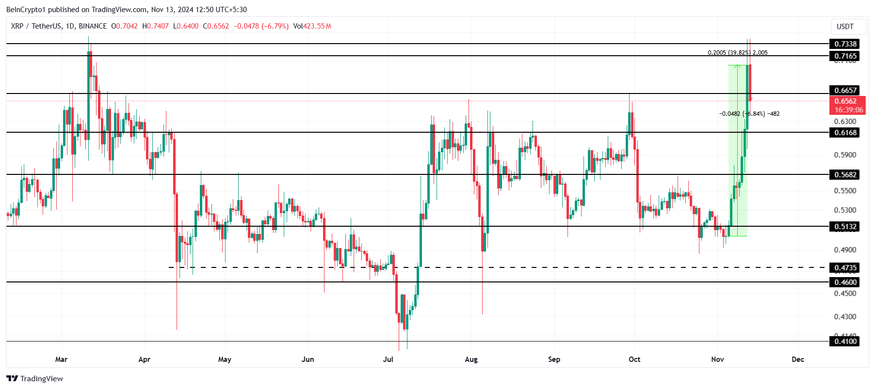 최근 40% 상승에도 불구하고 XRP는 8개월 저항선인 0.73달러를 넘지 못했습니다. 결과적으로, 이 알트코인은 이미 6% 하락했으며, 단기적으로 조정 단계가 있을 수 있음을 시사합니다.