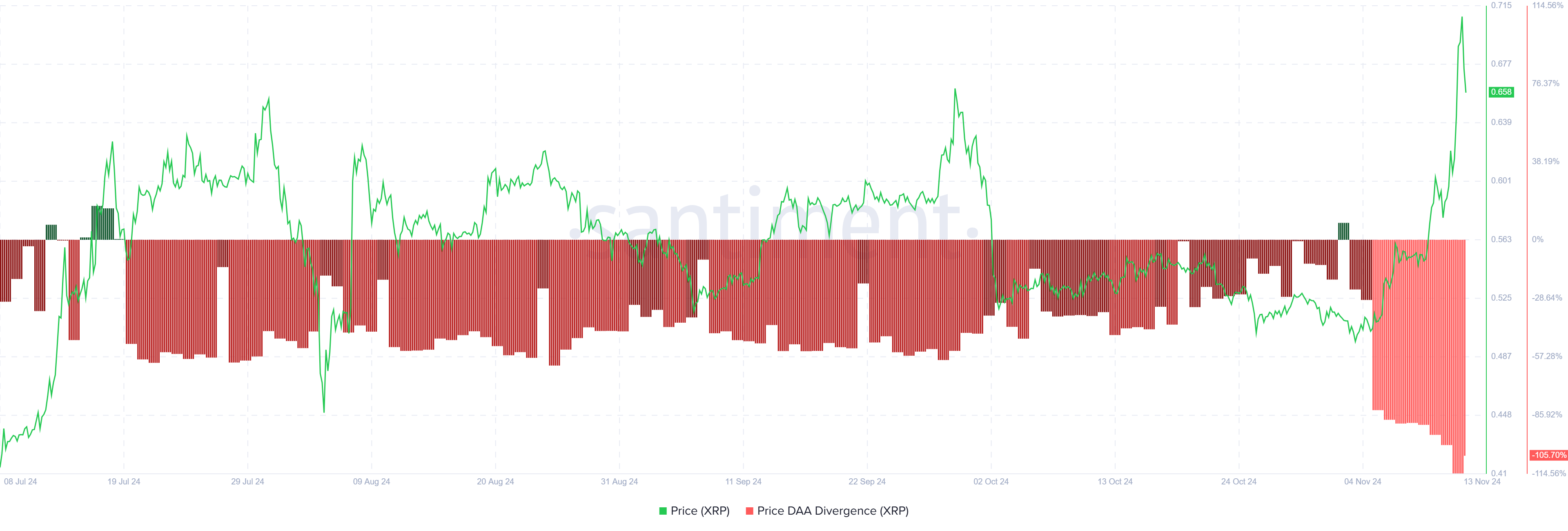 현재 가격 DAA(일일 활성 주소) 발산 지표가 XRP에 대한 매도 신호를 보내고 있습니다. 이 신호는 최근 가격 상승에도 불구하고 투자자 참여가 감소하면서 나타났으며, 시장에서 즉각적인 반응을 유발했습니다. 이로 인한 매도 압력은 오늘 가격이 6% 하락하는 데 기여했으며, 이는 매도 신호의 영향을 강조합니다.