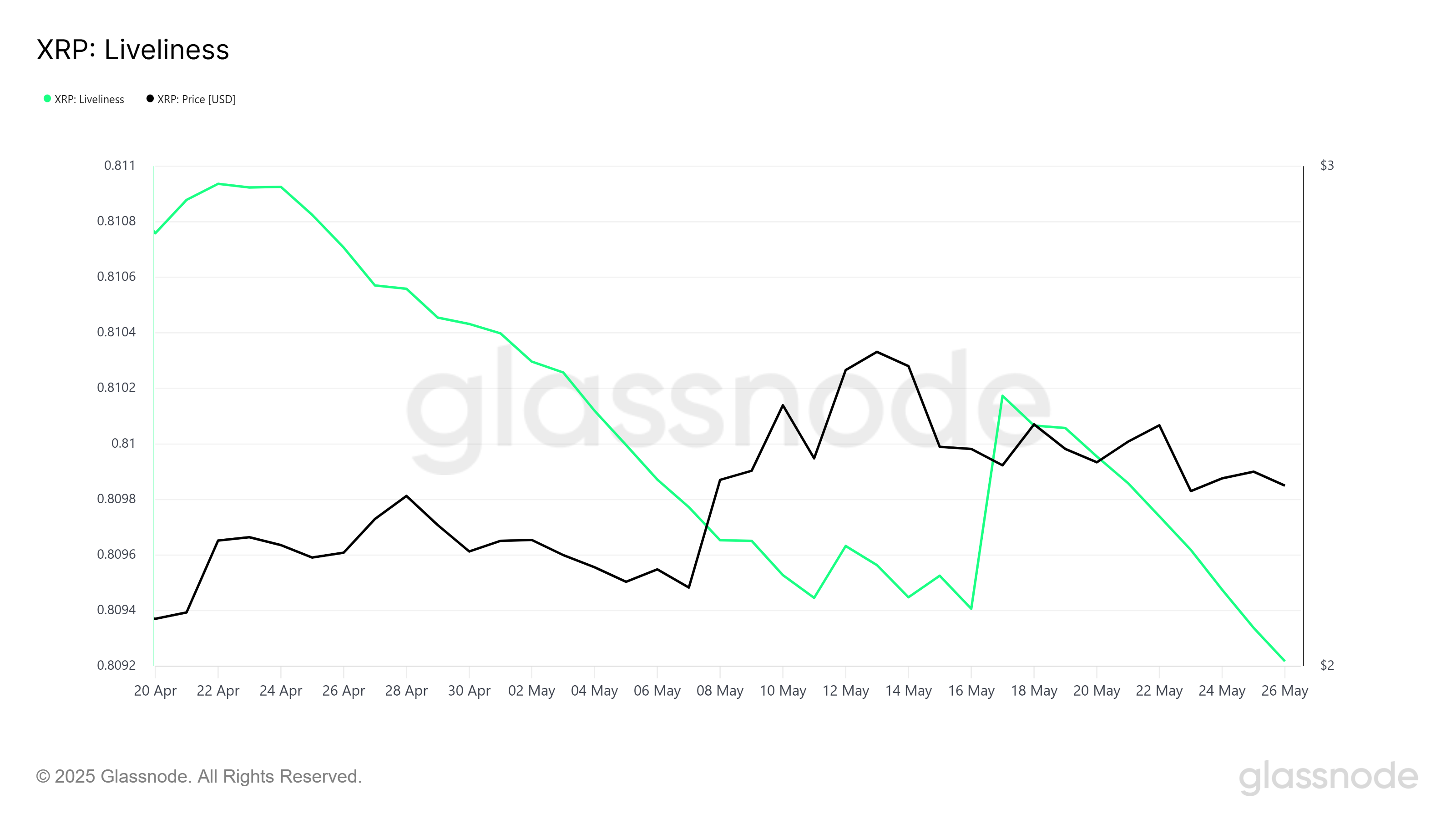 XRP의 라이블리니스 지표는 하락세를 보이며 장기 보유자(LTH)의 적극적인 축적을 나타냅니다. 라이블리니스의 하락은 이러한 투자자들이 가격 하락에도 불구하고 토큰을 보유하고 있음을 시사하며, 시장을 안정시키려는 의도를 보여줍니다. 이는 매도 압력이 증가했음을 나타내는 상승과는 대조적입니다.