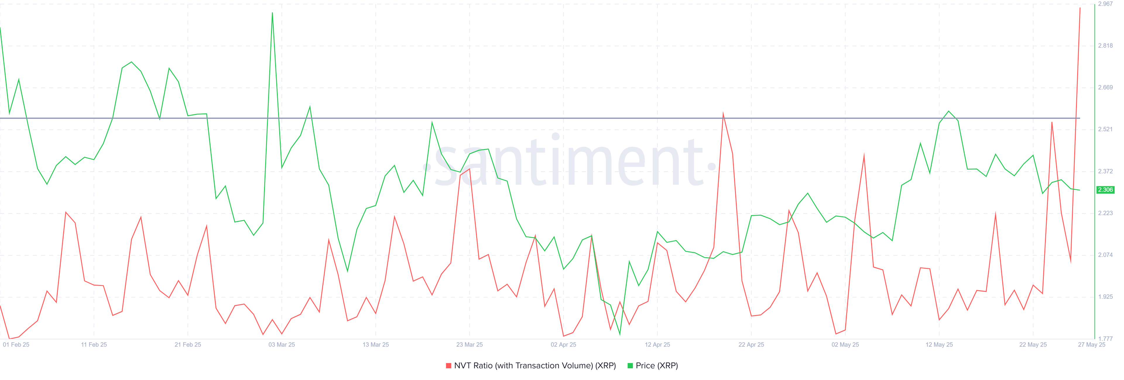 XRP의 네트워크 가치 대비 거래 비율(NVT)이 한 달 만에 최고 수준으로 급등했습니다. NVT 비율의 상승은 일반적으로 네트워크의 평가가 거래 활동을 초과함을 나타내며, 이는 가격 조정이 임박했음을 시사합니다. 이 지표는 XRP가 현재 사용에 비해 과대평가되었을 수 있음을 경고합니다.